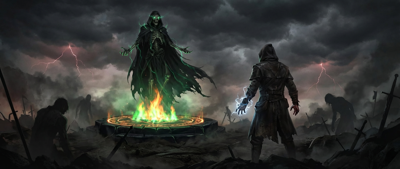 Alaran tenta agir, mas sua magia é aparada pelo Djinn segundos antes do salto de Aviran para a morte. Hel atravessa o vampiro com sua espada e se volta para Mira, que entoa três palavras de poder. O corpo estremece e chamas o consomem. Um portal se abre por poucos segundos, o suficiente para que dele emerja o esqueleto vivo envolto no manto do Lich Necromante Rashag.