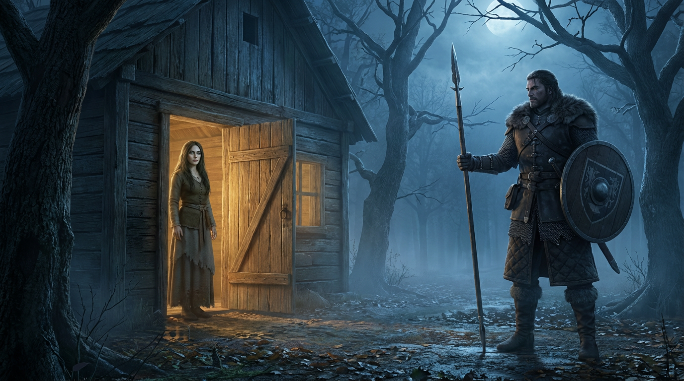 Enquanto caminha na direção da casa, o rapaz percebe a bela bruxa iniciar novos movimentos com as mãos. Ele ergue seu escudo, benzido pelo bispo, na intenção de proteger-se do mal que pode acometê-lo. E então ele ouve a voz em sua cabeça.